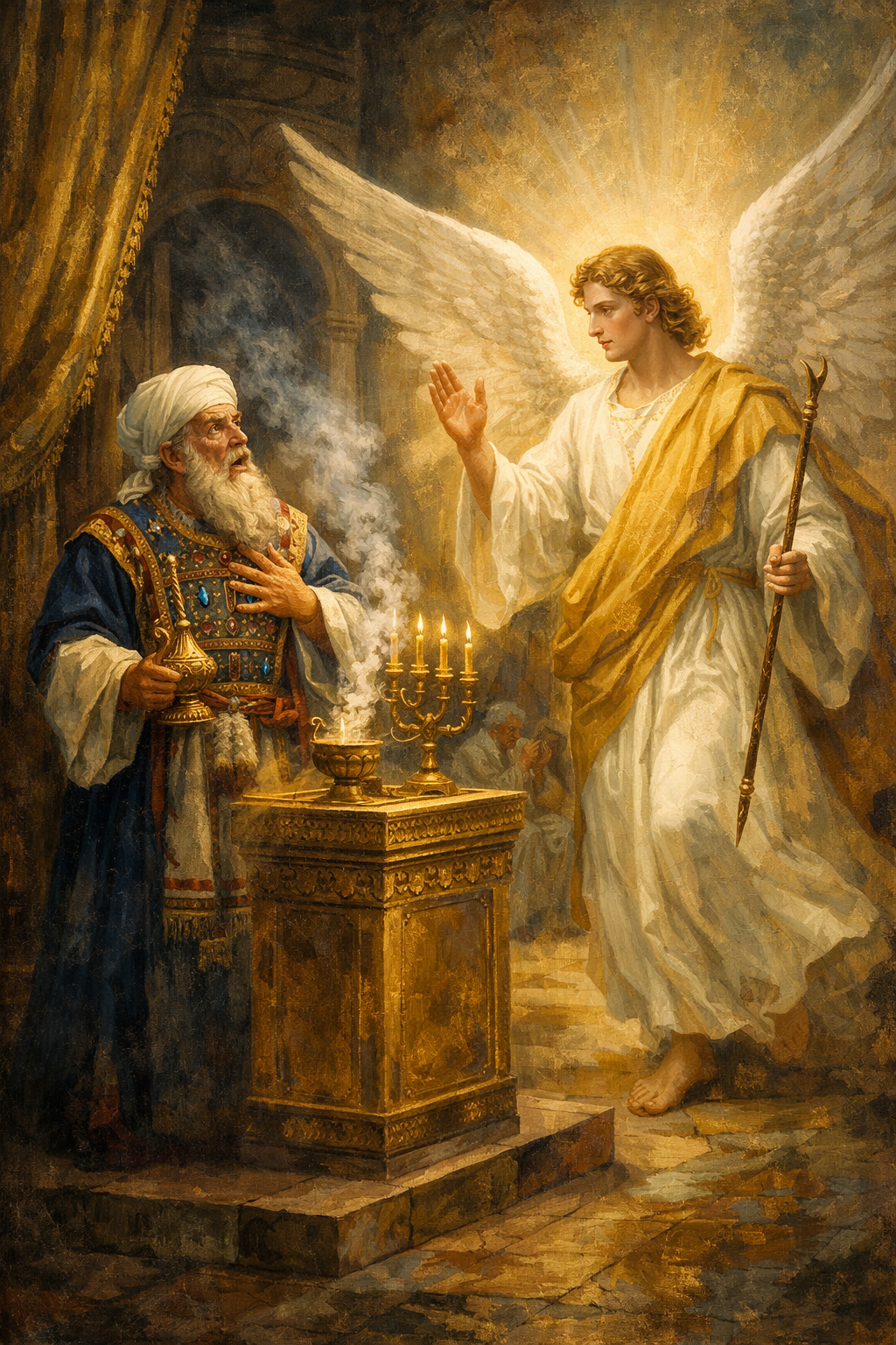 사제인 즈카르야가 사제 직무를 수행하기 위해 성소에 들어가 분향하러 갔는데, 그곳에서 주님의 천사를 만나게 됩니다. 두려움에 사로잡힌 즈카르야에게 천사는 청원이 받아들여졌다는 것, 그리고 아들의 이름을 ‘요한’으로 하라고 말합니다.