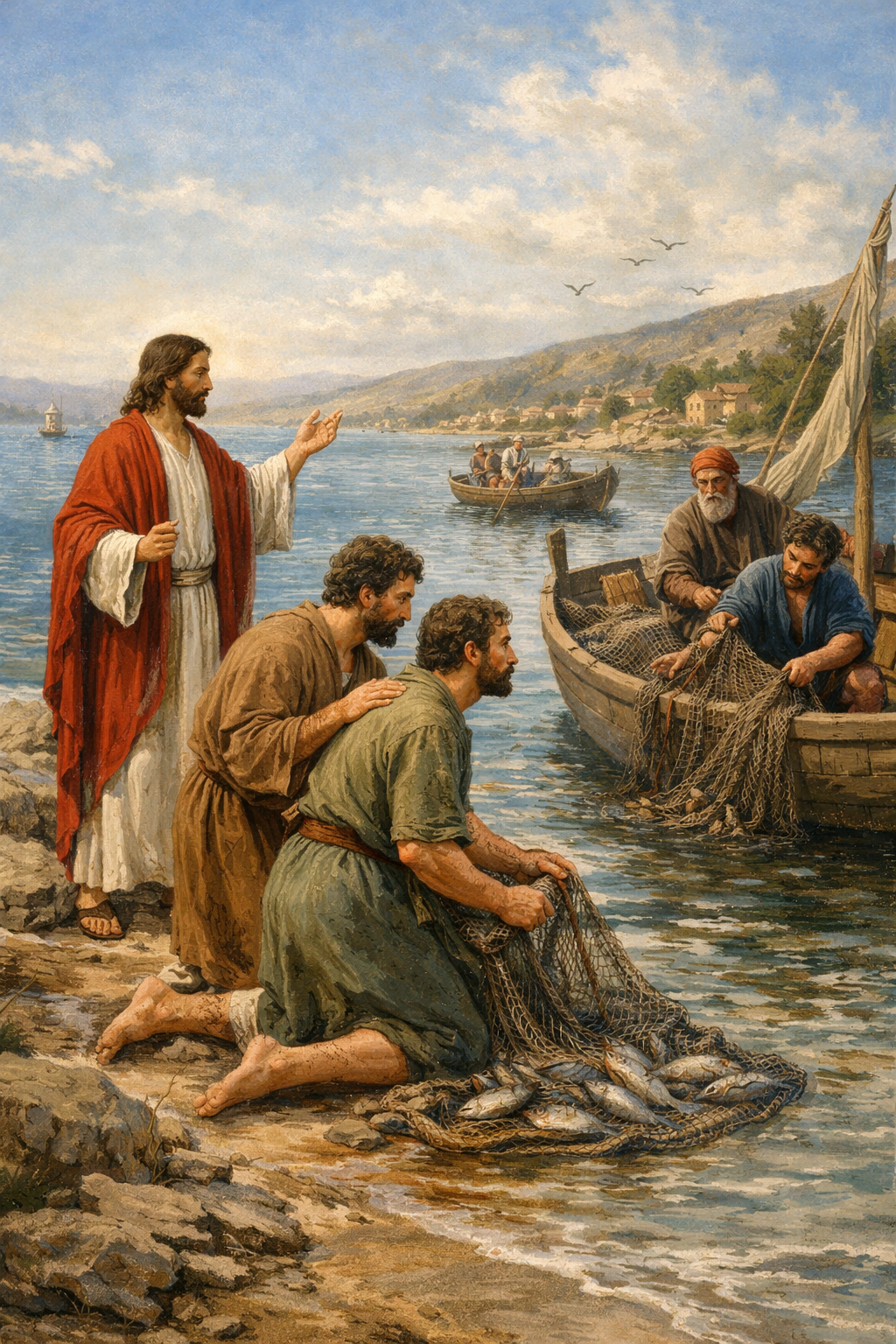 이제 제자들을 부르십니다. 그런데 이 제자들이 부르심을 받는 장소에 주목할 필요가 있습니다. 특별한 종교적 수련을 하고 있을 때가 아니라, 삶의 현장(그물을 던지고 있을 때, 배에서 그물을 손질하고 있을 때)에서 부르신다는 것입니다. 더군다나 당시에는 제자가 스승을 선택하곤 했는데, 여기서는 스승이신 예수님께서 직접 제자를 지명합니다. 부르심의 주도권이 철저하게 하느님께 있음을 보여주는 것입니다.