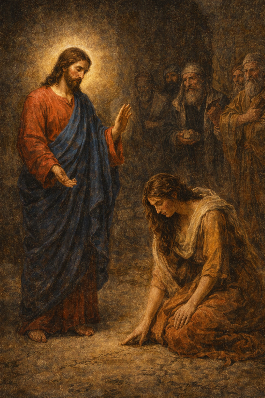 예수님께서는 유일하게 죄가 없으시므로 그녀에게 돌을 던질 수 있는 유일한 분이십니다. 그러나 심판관이신 그분은 단죄를 포기하시고 용서와 생명을 주십니다.